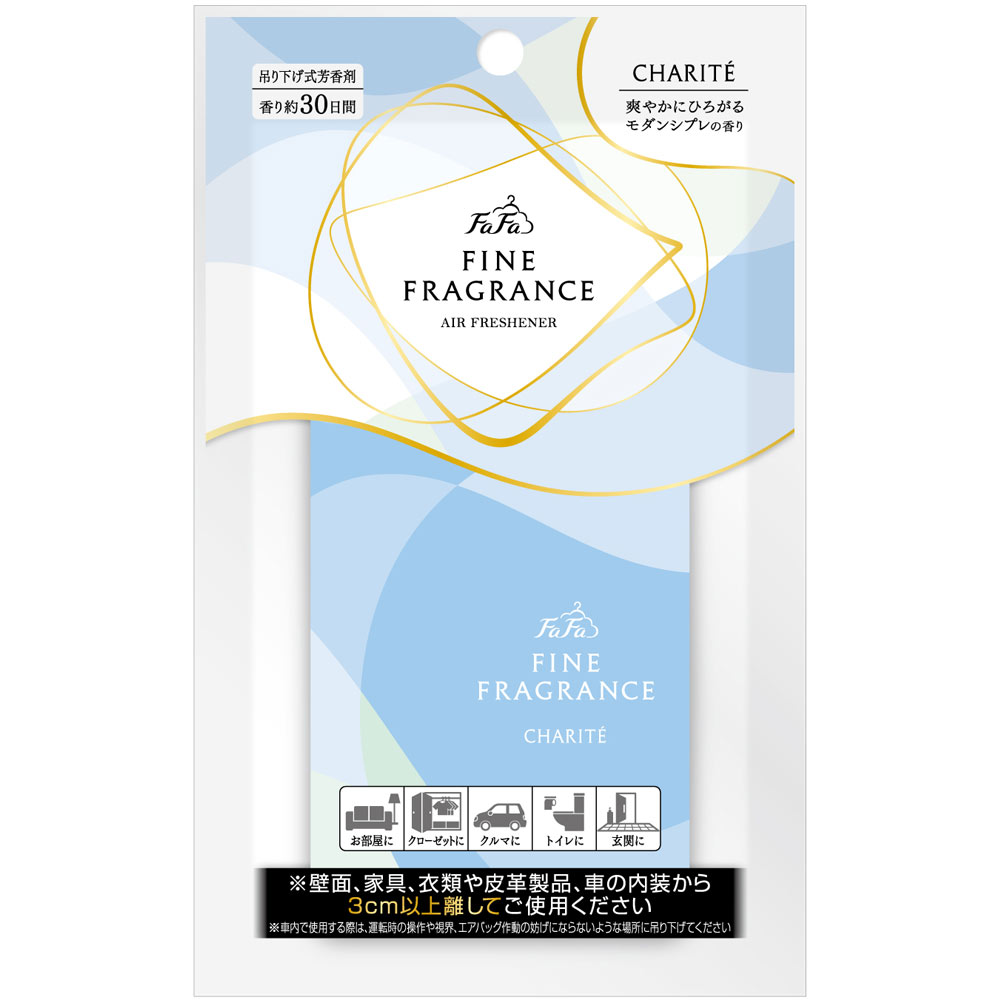 「ファーファファインフレグランス」シリーズの吊り下げ式芳香剤です。さわやかに広がるモダンシプレのシャリテの香り。お部屋のほか、車の中や玄関、クローゼットなど、においが気になるさまざまな場所でお使いください。
