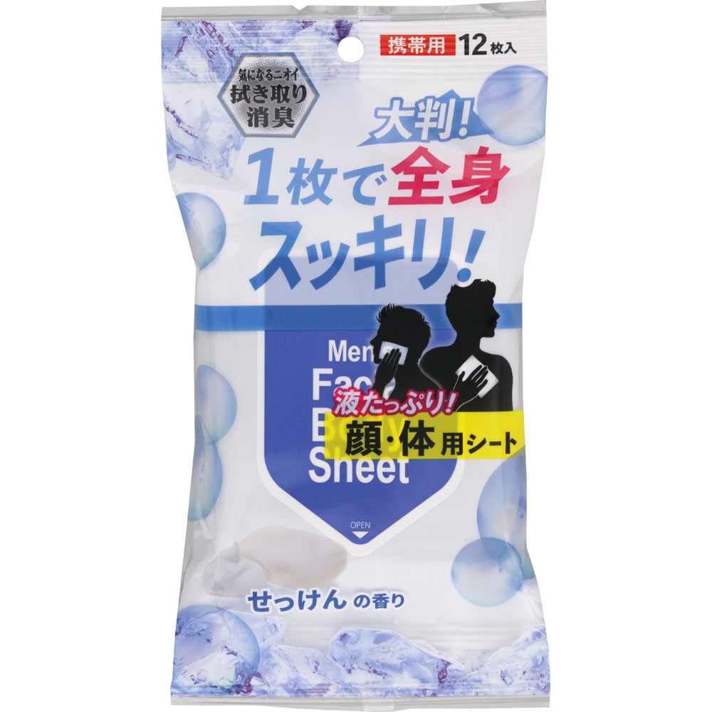 液をたっぷり含んだ、大判の男性用フェイス&ボディシートです。汗やニオイを拭き取り、1枚で全身ケアできます。通勤時やスポーツ時などさっぱりしたいときにお使いください。携帯用の12枚入り。