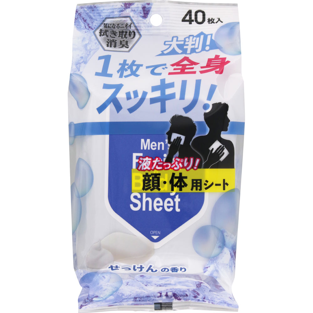 液をたっぷり含んだ、大判の男性用フェイス&ボディシートです。汗やニオイを拭き取り、1枚で全身ケアできます。通勤時やスポーツ時などさっぱりしたいときにお使いください。さわやかなせっけんの香り。40枚入り。