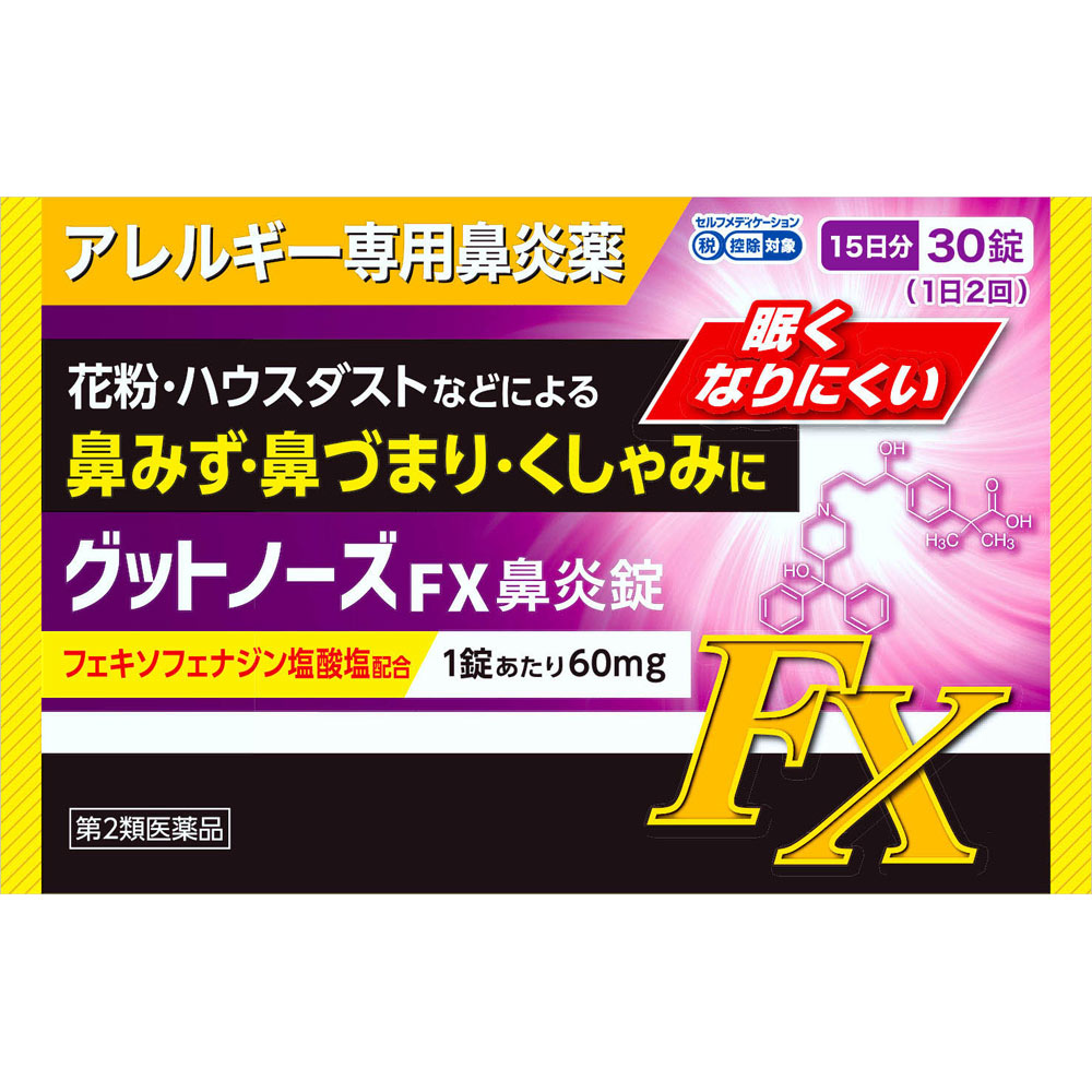 抗ヒスタミン成分のフェキソフェナジン塩酸塩を配合したアレルギー専用薬です。花粉やハウスダストによる鼻水、鼻づまり、くしゃみなどのつらいアレルギー症状を緩和します。15才以上で、1回1錠、1日2回朝夕にお飲みください。