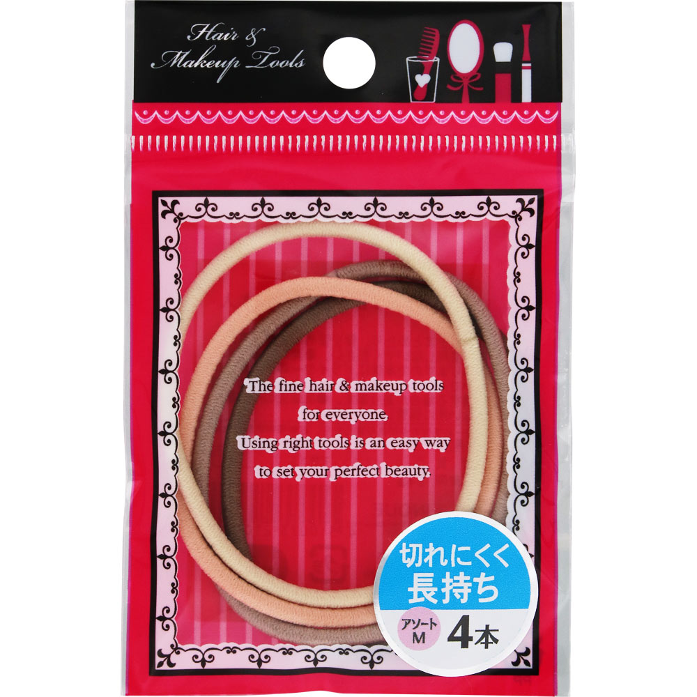 切れにくい特殊加工を施したリングタイプのヘアゴムです。独自の接着方法で、つなぎめがほとんど目立たず、しなやかでやわらかい使用感です。ゴムはラテカラー。Mサイズ4本入り。
