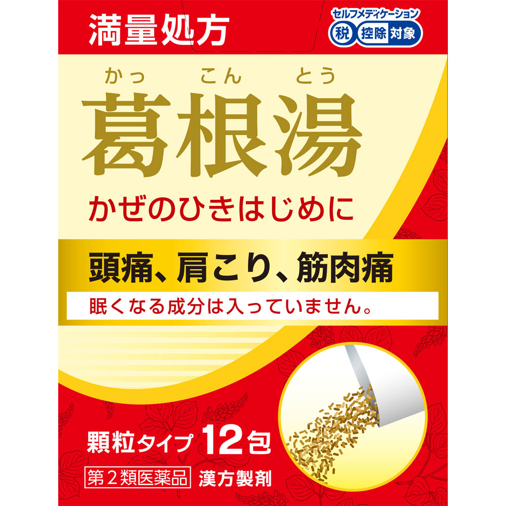 漢方処方「葛根湯」の顆粒剤です。体を温めて発汗を促すことで、頭痛や肩こりなどのかぜのひきはじめの症状に効果を発揮します。眠くなる成分は入っていません。