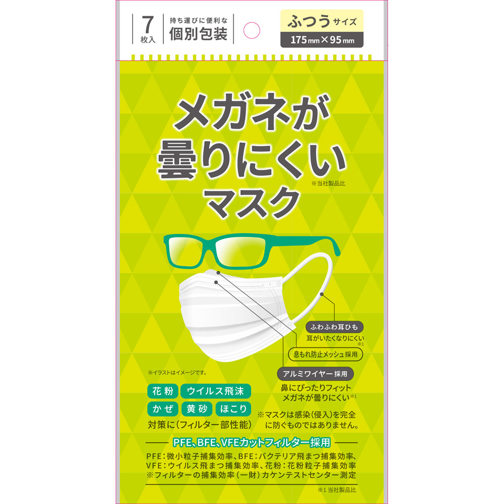 鼻にぴったりフィットするアルミワイヤーと息もれ防止メッシュを採用した、メガネが曇りにくいマスクです。ふわふわの耳ひもで耳が痛くなりにくいのもポイント。衛生的で持ち運びに便利な個包装タイプです。7枚入り。
