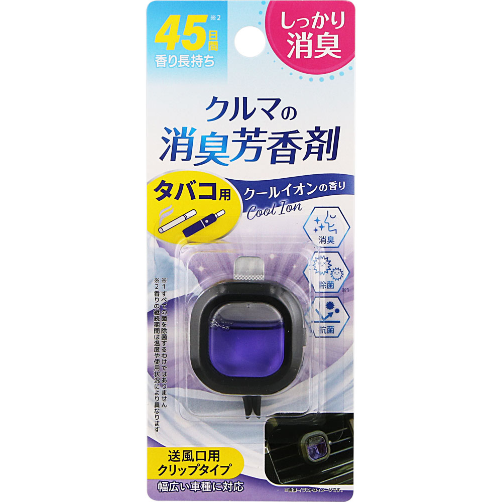 クルマのニオイ対策に 車専用の消臭・芳香剤です。エアコンの送風口に取り付けるだけで車内を消臭。クールイオンの香りがさわやかに広がります。車内のニオイが気になる方、快適な空間を保ちたい方におすすめです。