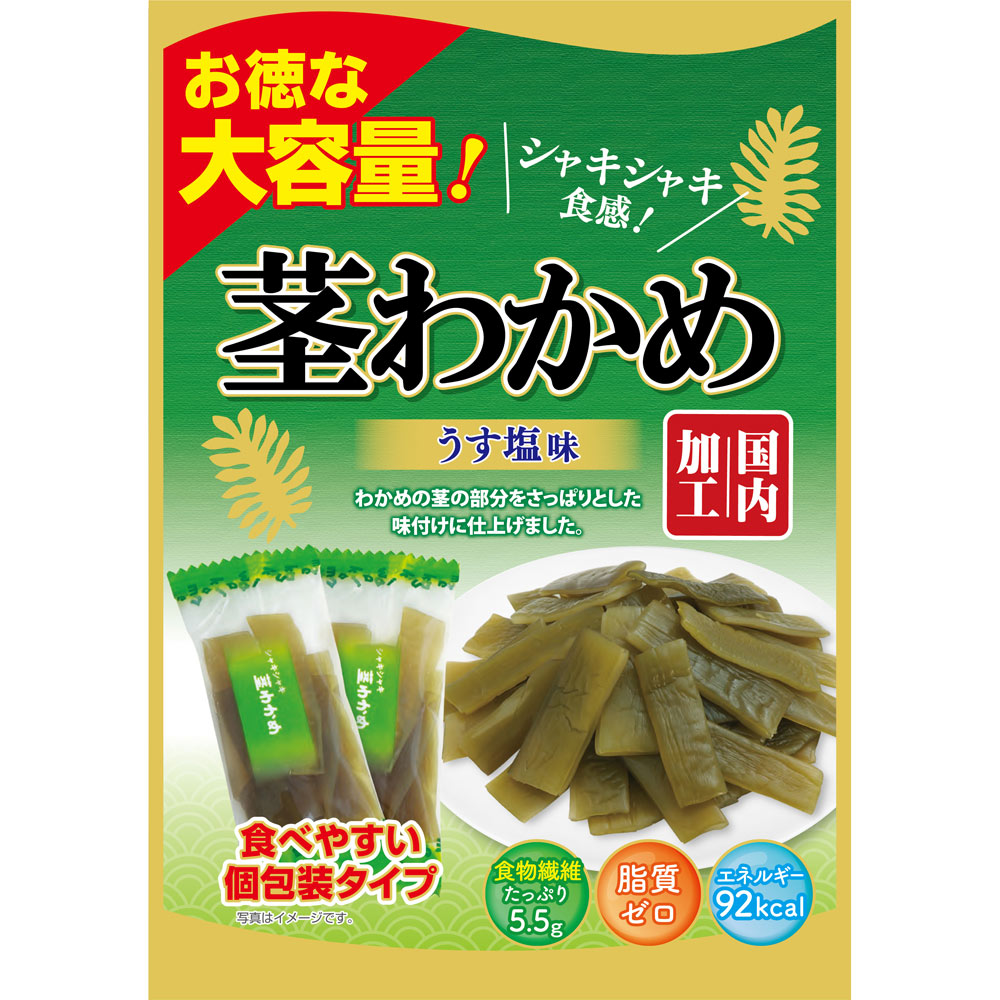 わかめの茎を薄めの塩味でつけ込み、さっぱりとした味に仕上げました。シャキシャキとした食感が食べ応え抜群で、手軽に食物繊維が摂れます。個包装タイプで食べやすく、小腹がすいたときやダイエット中のおやつにおすすめです。