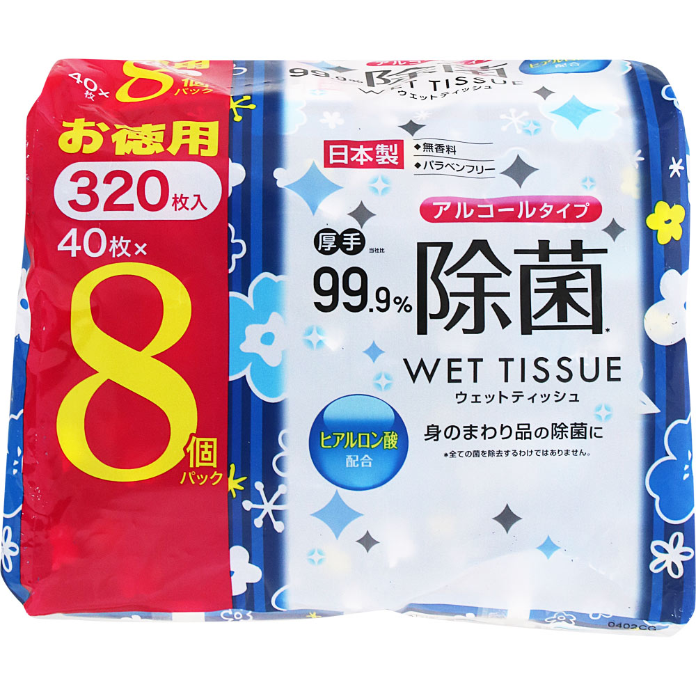 持ち運びに便利なアルコール除菌ウェットティッシュです。身の回りの除菌やキッチンの掃除などにお使いください。シートには手肌にやさしいヒアルロン酸を配合しています。40枚×8個入り。
