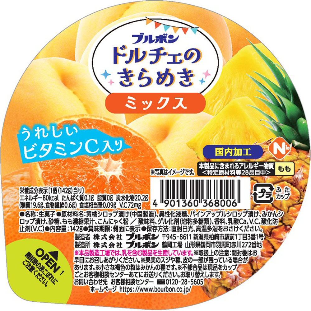 みずみずしいゼリーに黄桃、みかん、パインを合わせました。ビタミンCを配合。食後のデザートやお子さまのおやつにどうぞ。