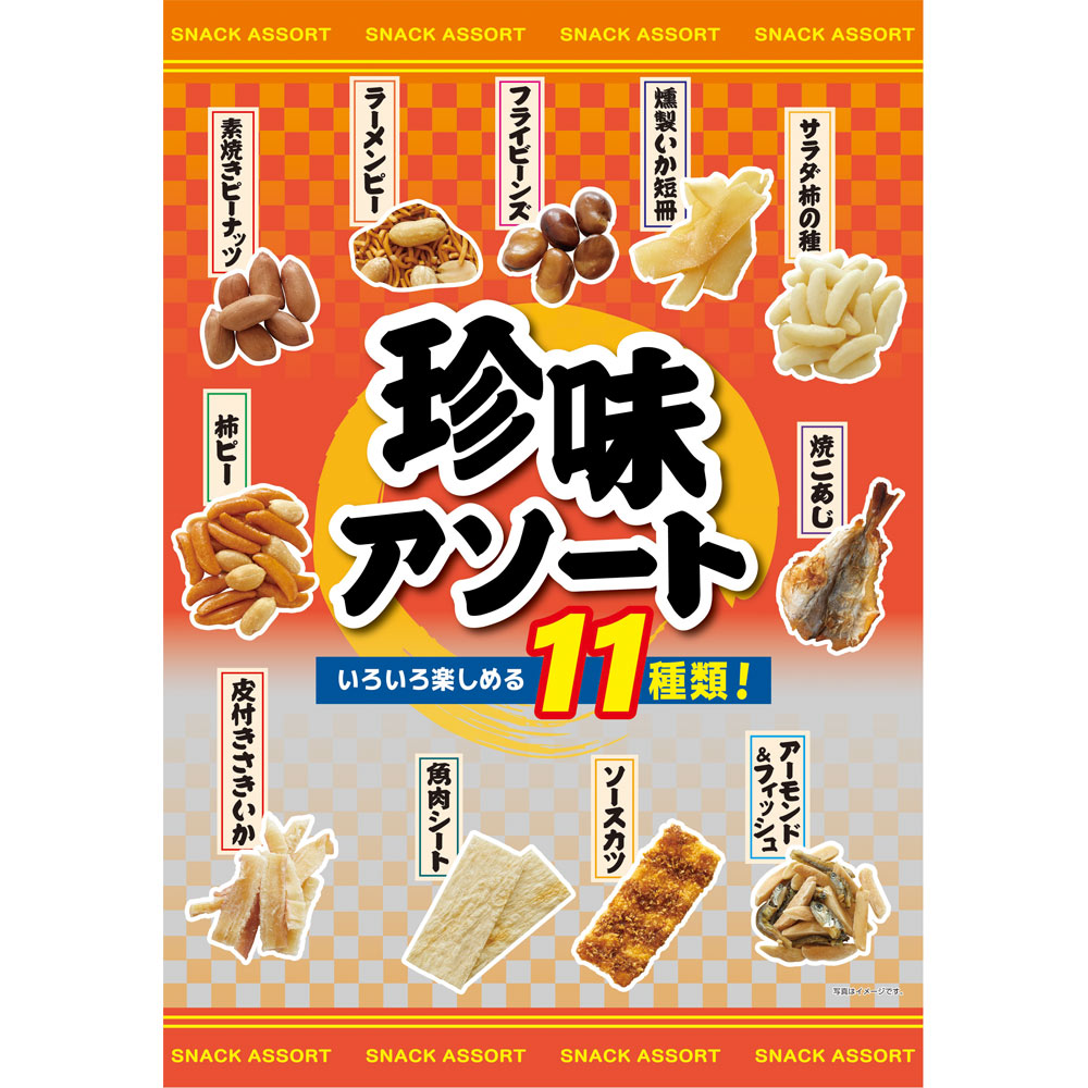 柿ピー、ラーメンピー、フライビンズ、素焼きピーナッツ、サラダ柿の種、皮付きさきいか、燻製いか短冊、焼こあじ、アーモンド&フィッシュ、ソースカツ、魚肉シート、計11種の珍味と豆菓子をアソートしました。お酒のおつまみにはもちろん、おやつやお茶請けにもおすすめです。