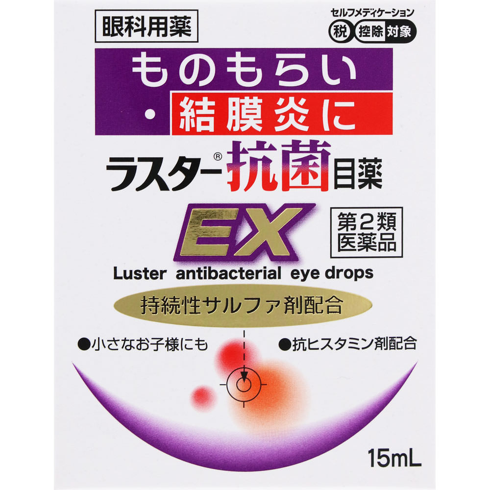 「ラスター抗菌目薬EX」は、クロルフェニラミンマレイン酸塩がかゆみをやわらげ、スルファメトキサゾールナトリウムの抗菌作用により、まぶたの腫れ・痛みを緩和し、不快な症状を改善します。