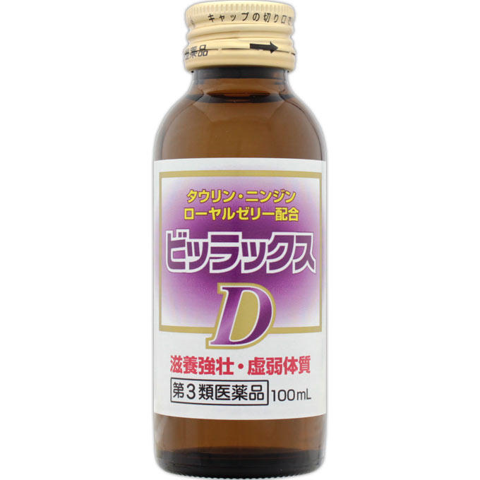 生薬ニンジン、ローヤルゼリーをはじめ、タウリンやビタミンB群(4種)を配合した飲みやすい風味の100mLドリンクです。滋養強壮、虚弱体質、肉体疲労時の栄養補給に効果があります。