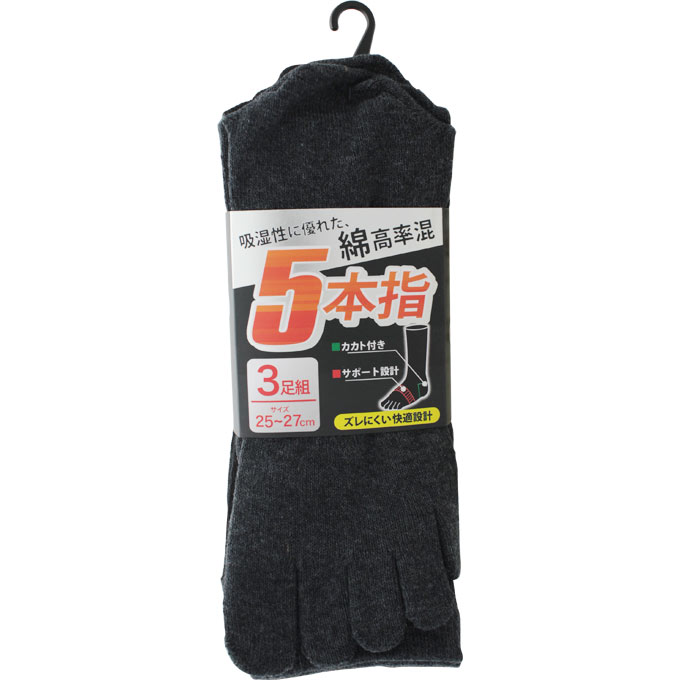 5本指で快適に! とってもお得な、3足組の五本指ソックスです。吸水性に優れた綿混素材。カカト付サポート設計でズレにくい!