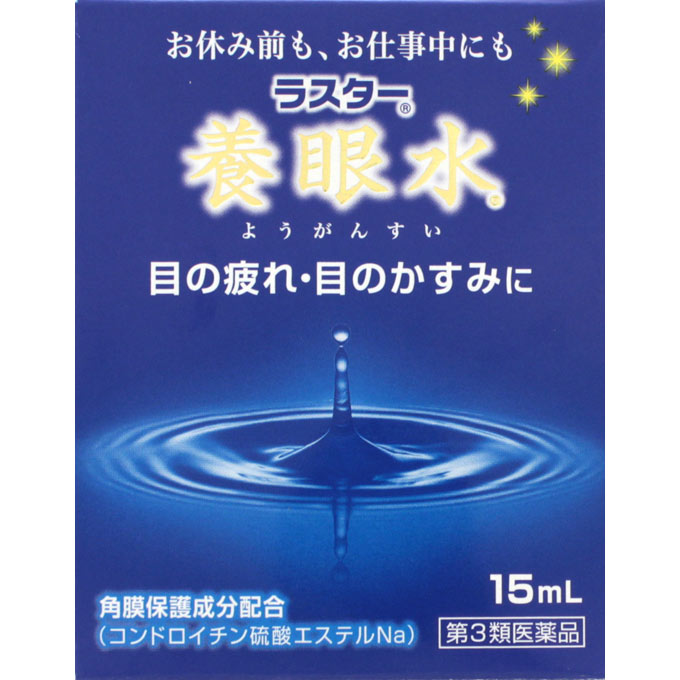 「ラスター養眼水」は、血行促進作用、抗酸化作用をもつビタミンEや目の新陳代謝を活発にするビタミンB6、タウリン、目の細胞のはたらきを促進し、目の疲れを改善するL-アスパラギン酸カリウム、角膜を保護し眼病を予防するコンドロイチン硫酸エステルナトリウムを配合した、おやすみ前にもお使いいただける目薬です。1日中働き続け、負担をかけた目の疲れをとり、目に栄養とうるおいを与えます。