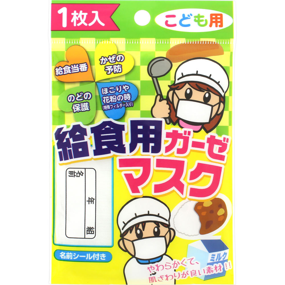 やわらかくて、肌ざわりの良い素材を使用したこども用ガーゼマスクです。マスクの中に、ほこりを防ぐフィルターを挟んでいます。かぜ予防のほか、花粉、ほこりからも、のどを守ります。便利な名前シール付き。