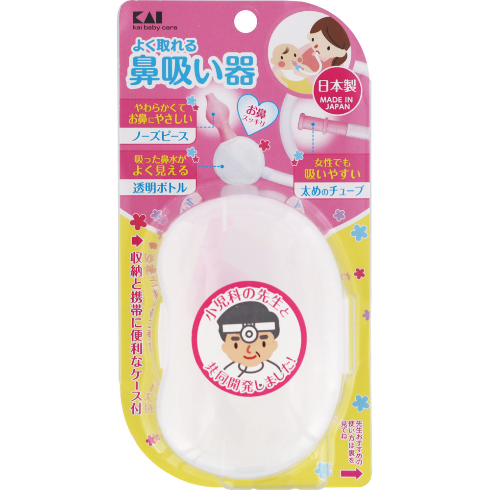 よく取れる日本製の鼻吸い器 やわらかなノーズピースと太めのチューブ、吸った鼻水がよく見える透明ボトルが特長の鼻吸い器です。口もとで吸う力を加減しやすいので、鼻水をやさしく吸い取ることができます。また、分解しやすいので洗浄が簡単。収納と携帯に便利なケースが付属されている。日本製。
