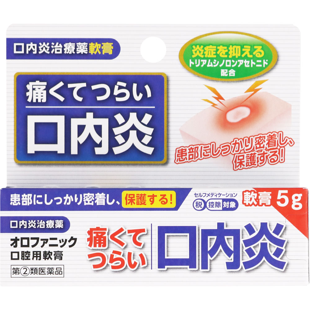 痛くてつらい口内炎(アフタ性)に効果を現す口内炎治療薬軟膏です。口腔粘膜への優れた付着力で患部を保護するとともに、抗炎症作用により患部の炎症を抑え、それに伴う痛みも改善します。