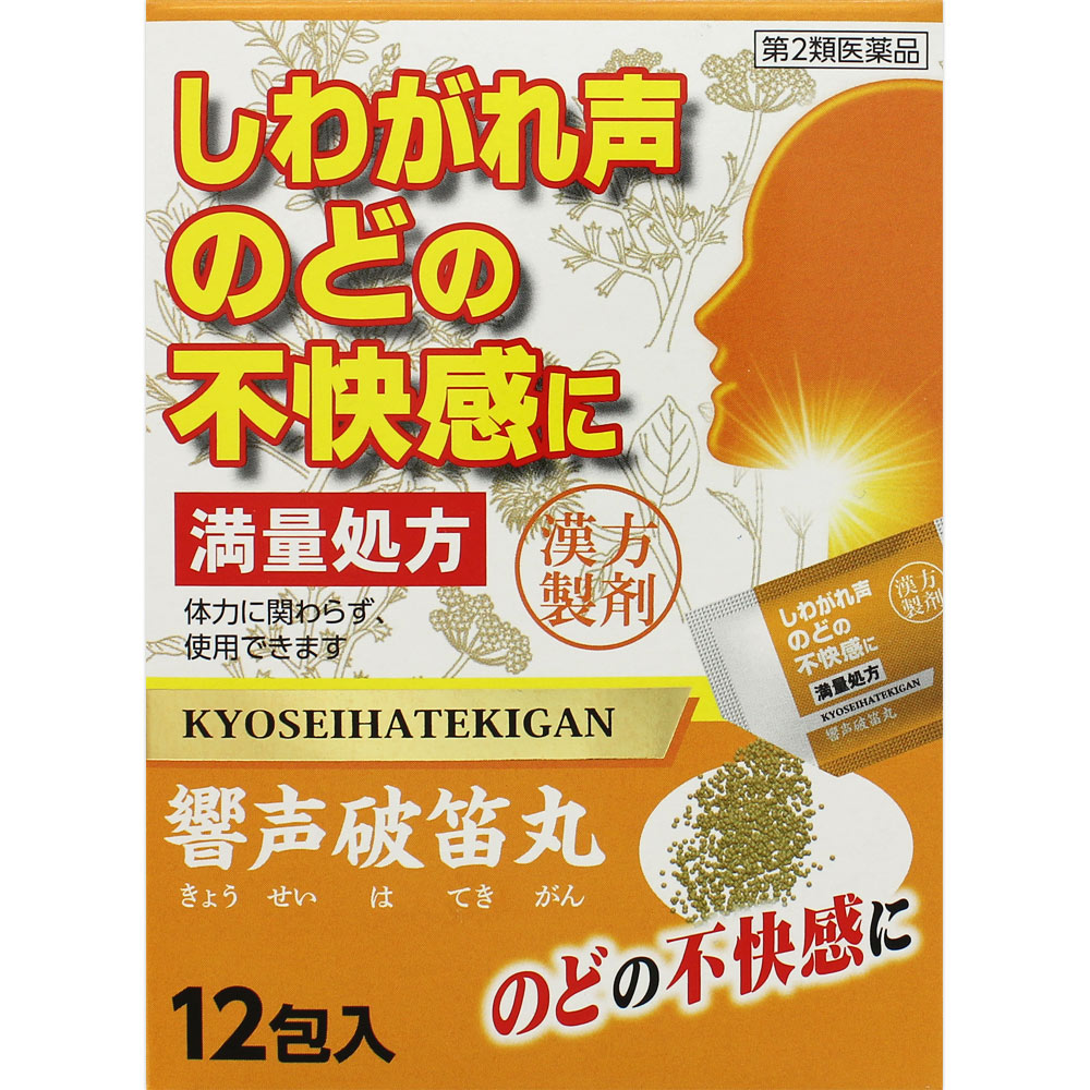 しわがれ声やのどの不快感に適した漢方処方<響声破笛丸(きょうせいはてきがん)>を顆粒にして、携帯しやすくしました。エキス量は満量処方の5400mg(成人1日量あたり)で、のどに違和感が生じたときにいつでも使用できます。分包タイプ。12包入り。