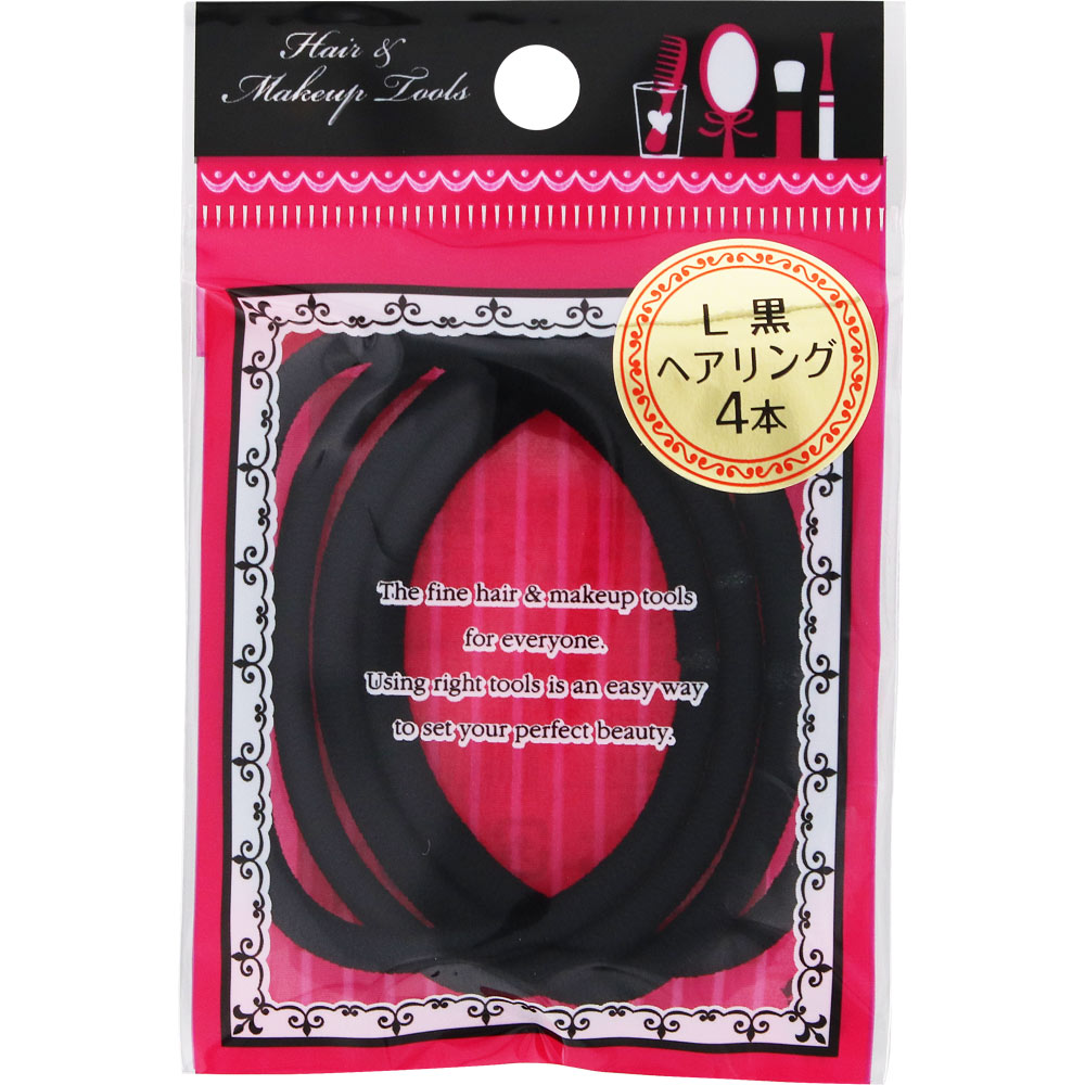 切れにくい特殊加工を施したリングタイプのヘアゴムです。独自の接着方法で、つなぎめがほとんど目立たず、しなやかでやわらかい使用感です。ゴムは黒色。Lサイズ4本入り。