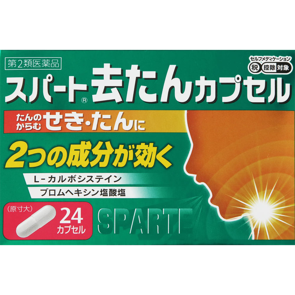 「スパート去たんカプセル」は、2つの去たん成分のみを配合した鎮咳去たん薬です。<L-カルボシステイン>が、たんを薄めるとともに、たんを排出する線毛の動きをよくして出しやすくし、<ブロムヘキシン塩酸塩>がたんを薄めてスムーズに排出させることで、せきを鎮めます。8才のお子様から服用できます。