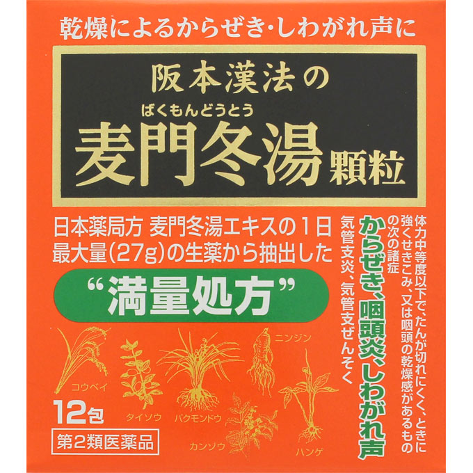 把日本药局方麦门冬汤提取物,满量配方的颗粒制剂。体力中等以下、排痰困难、时而咳嗽不止,或者咽头有干燥感人的干咳、咽炎、声音嘶哑、气管炎、支气管哮喘等拥有缓解症状。由于不含发困成分,开车司机等人也可以服用