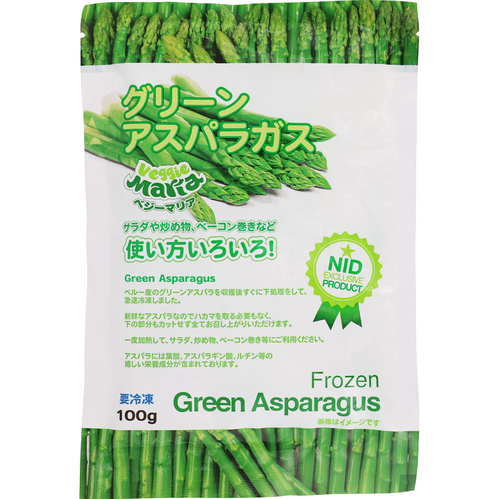 把事先准备好的新鲜绿芦笋,进行急速冷冻处理。没有硬芯、品尝到整个芦笋的鲜美味道。由于绿色鲜艳而口感鲜嫩,用于各种菜谱。请用于色拉、炒菜、腊肉芦笋卷。