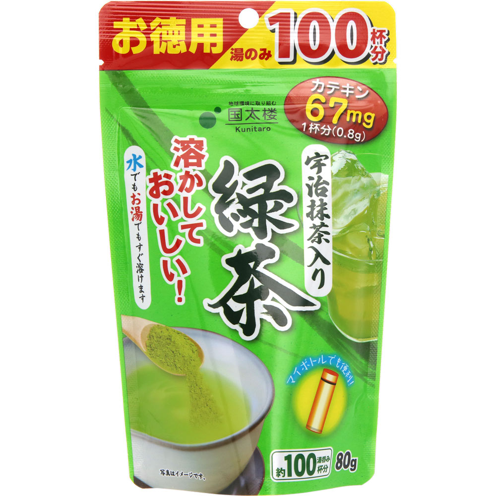 由于含宇治抹茶,味道温和的速溶绿茶。易溶化、不管是水还是开水都迅速溶化。每1杯(使用0.8g时)可摄取<儿茶酸>约67mg。容易保管的拉链袋包装。